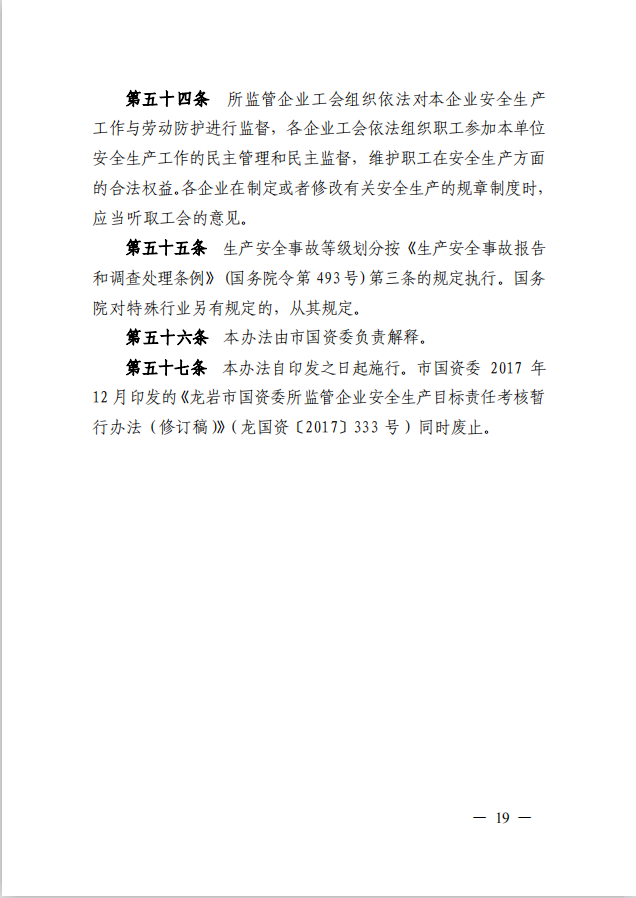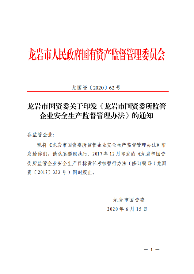 龍巖市國資委關(guān)于印發(fā)《龍巖市國資委所監(jiān)管企業(yè)安全生產(chǎn)監(jiān)督管理辦法》的通知(龍國資[2020]62號)
